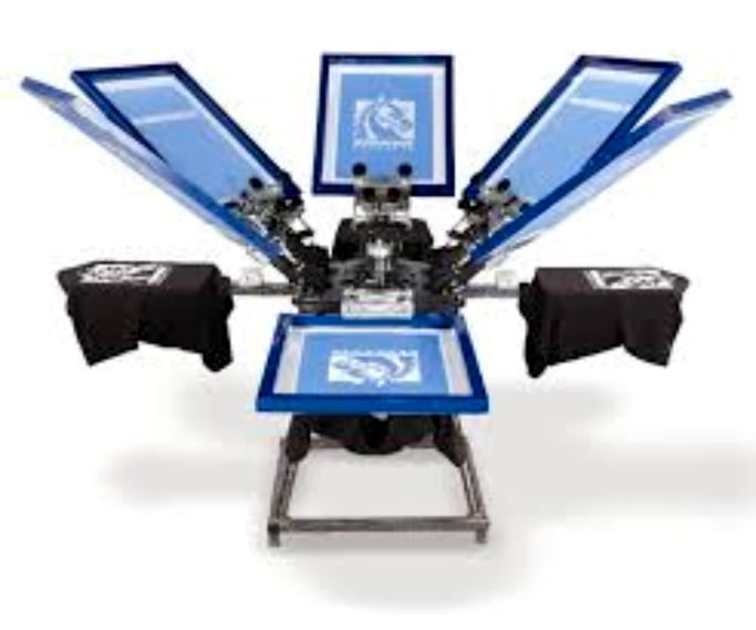 The image features a multi-color screen printing machine, prominently displaying blue screens and black t-shirts ready for printing.