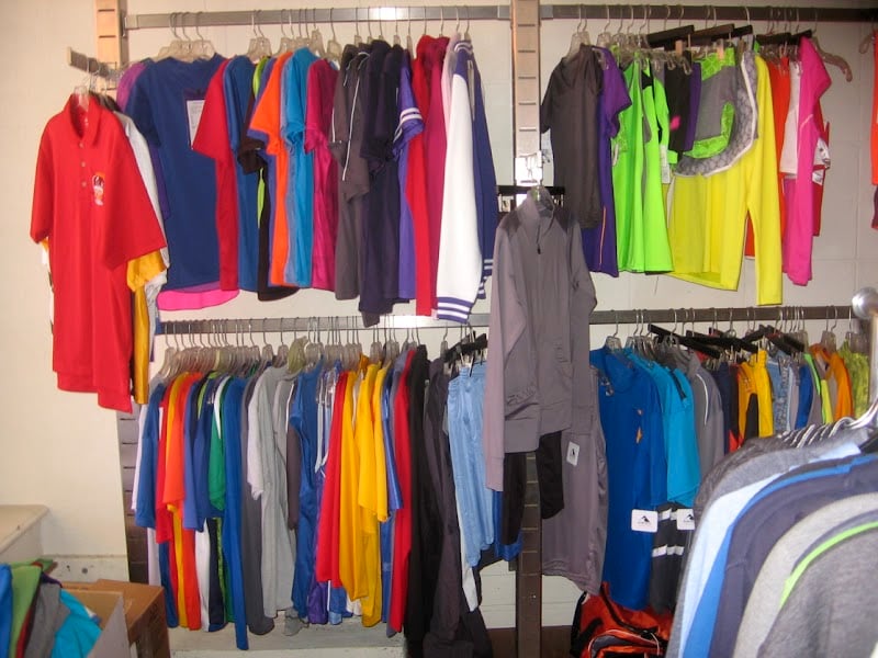 The image showcases a vibrant display of various clothing items, including colorful polo shirts and athletic wear, neatly arranged on hangers.