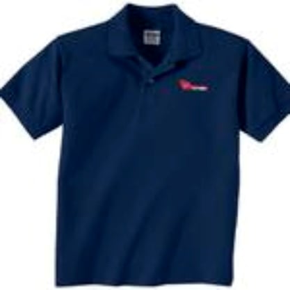 The image shows a navy blue polo shirt with a logo, likely representing a brand or store. The shirt is neatly displayed, emphasizing its quality and design.