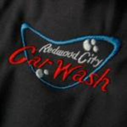 The image features a close-up of an embroidered logo for "Redwood City Car Wash" on a black fabric. The design includes blue and red elements, showcasing the quality of embroidery.