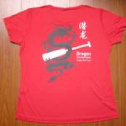 The image features a vibrant red t-shirt adorned with a graphic design of a dragon and a baseball bat.