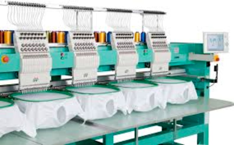 The image showcases a multi-needle embroidery machine with vibrant thread spools, set against a clean, organized workspace.