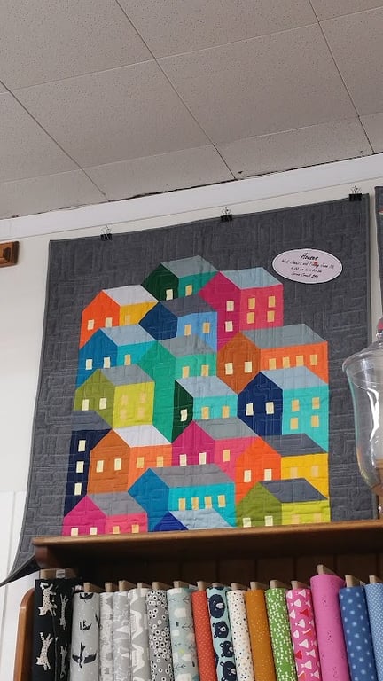 The image showcases a vibrant quilt featuring colorful houses, displayed prominently on the wall of Quilt Emporium.