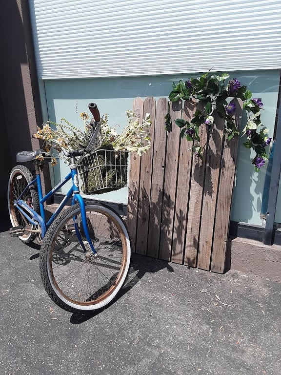A blue bicycle with a basket filled with dried flowers leans against a wooden fence outside a sewing store.