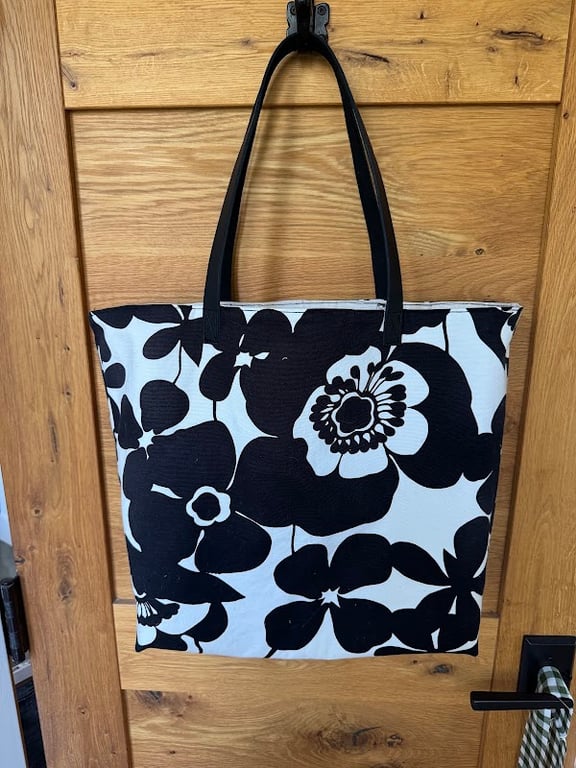 A stylish black and white floral tote bag hangs against a wooden backdrop, showcasing the fabric's texture and design.