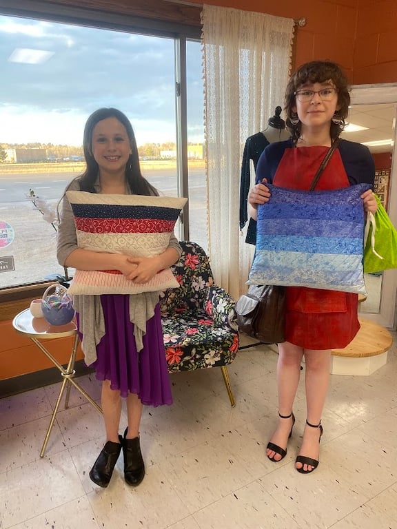 Two young girls proudly display handmade pillows in a vibrant sewing store.