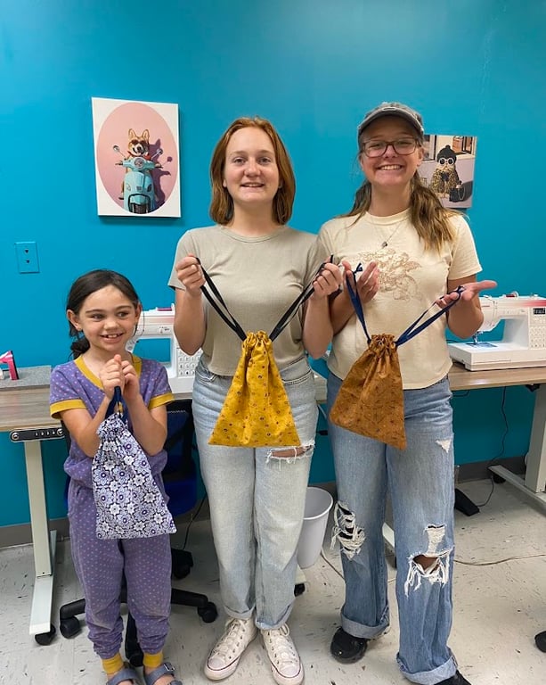 Three individuals proudly display their handmade drawstring bags in a vibrant sewing studio.