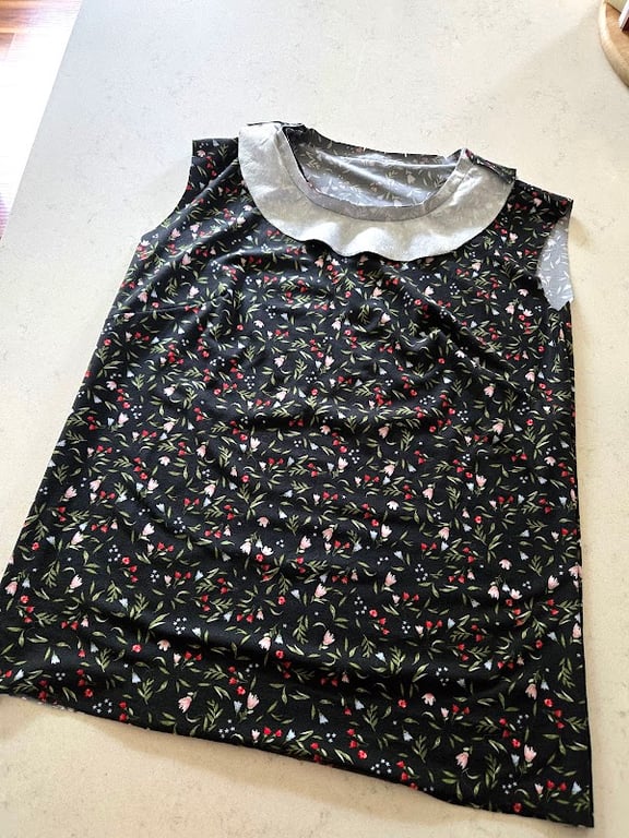 A floral-patterned black fabric top with a silver collar lies on a light countertop.