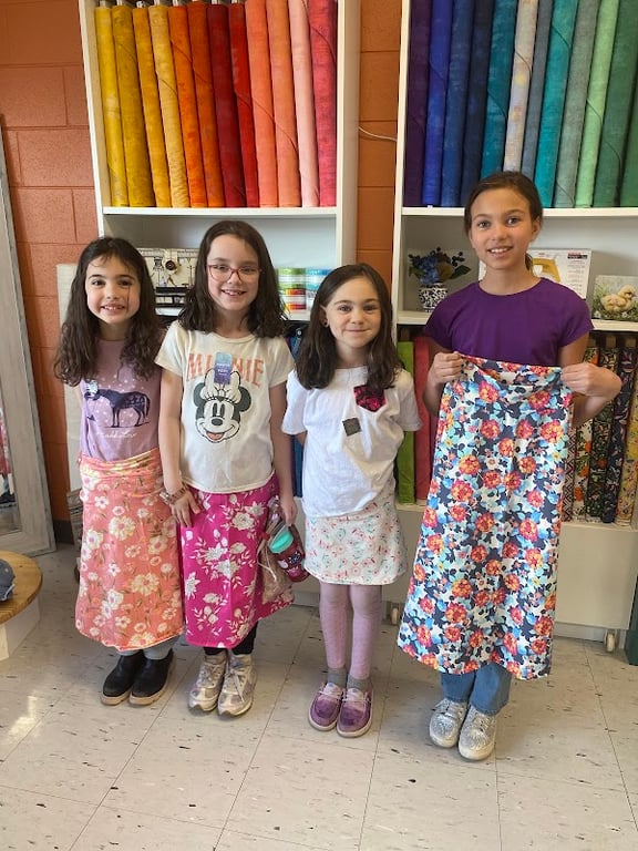 Four children stand in a vibrant sewing store, showcasing their handmade skirts. Behind them, colorful fabric rolls are neatly displayed on shelves, creating a lively atmosphere.