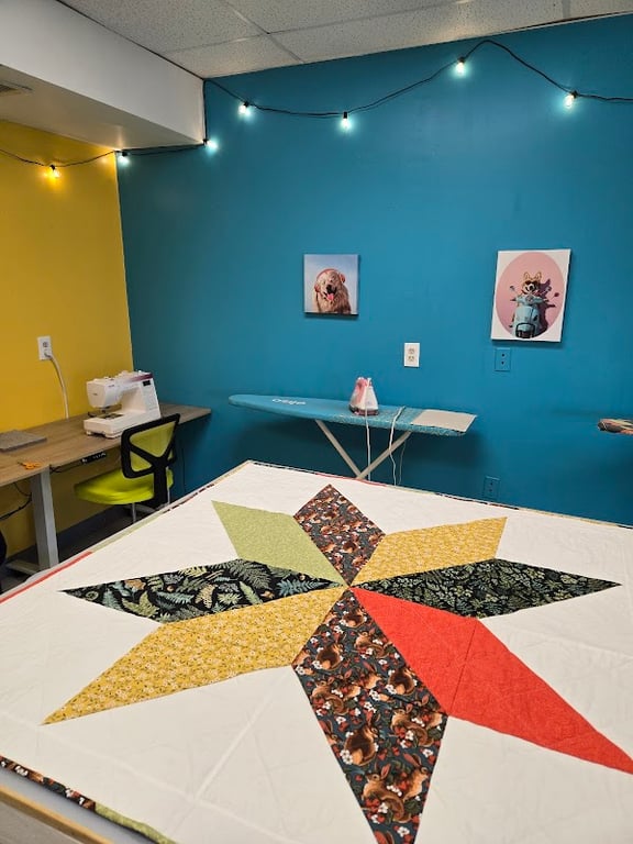A vibrant sewing studio features a colorful star quilt on a table, surrounded by a sewing machine, ironing board, and playful wall art.