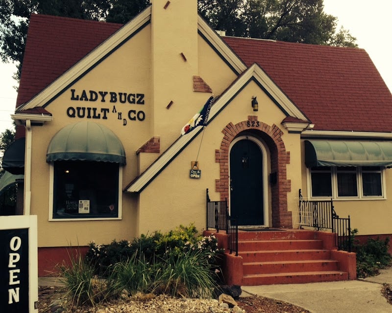 The image shows the charming exterior of Ladybugz Quilt & Yarn, a sewing store with a welcoming entrance and a sign indicating it is open.