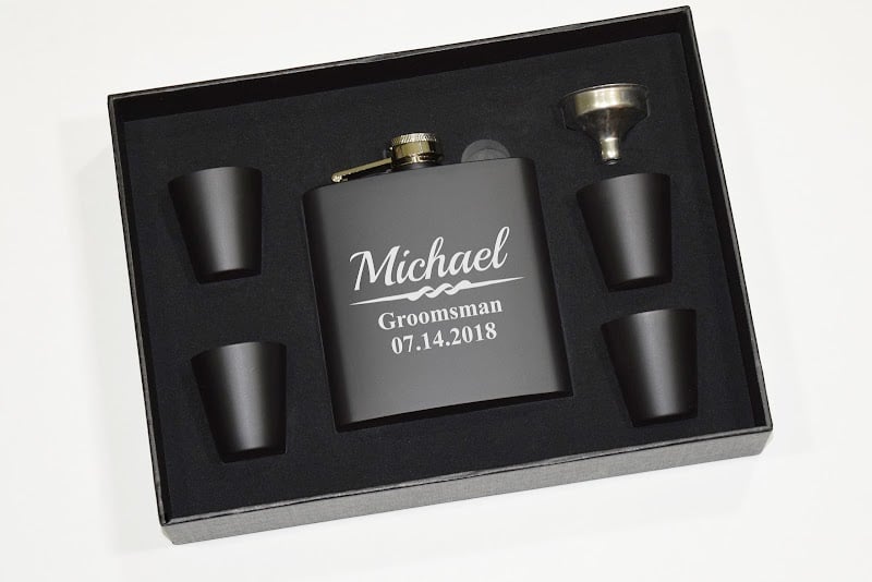 A sleek black gift set features a personalized flask and two matching shot glasses, elegantly displayed in a fitted box.