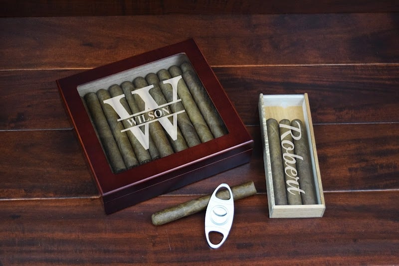 A polished wooden box displays engraved cigars, featuring the name "WILSON" prominently. Next to it, a smaller box holds more cigars labeled "Robert.