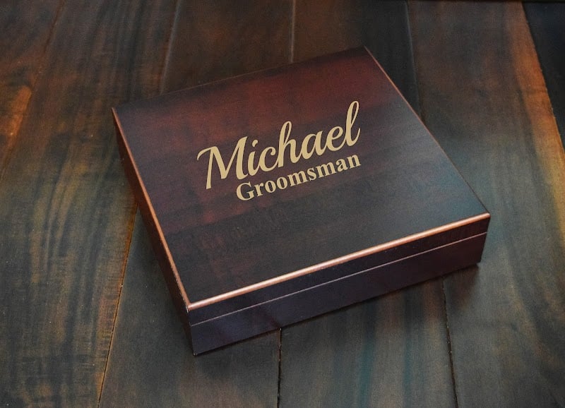 A polished wooden box is engraved with the name "Michael" and the word "Groomsman," resting on a rustic wooden surface.