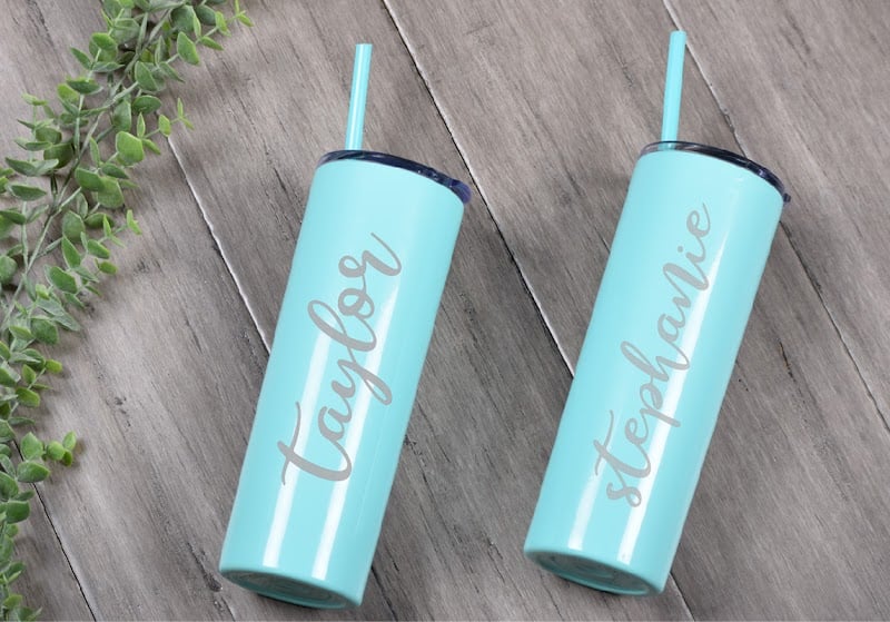 Two personalized turquoise tumblers with names "taylor" and "stephanie" are displayed on a wooden surface, surrounded by greenery, showcasing custom engraving services offered by
