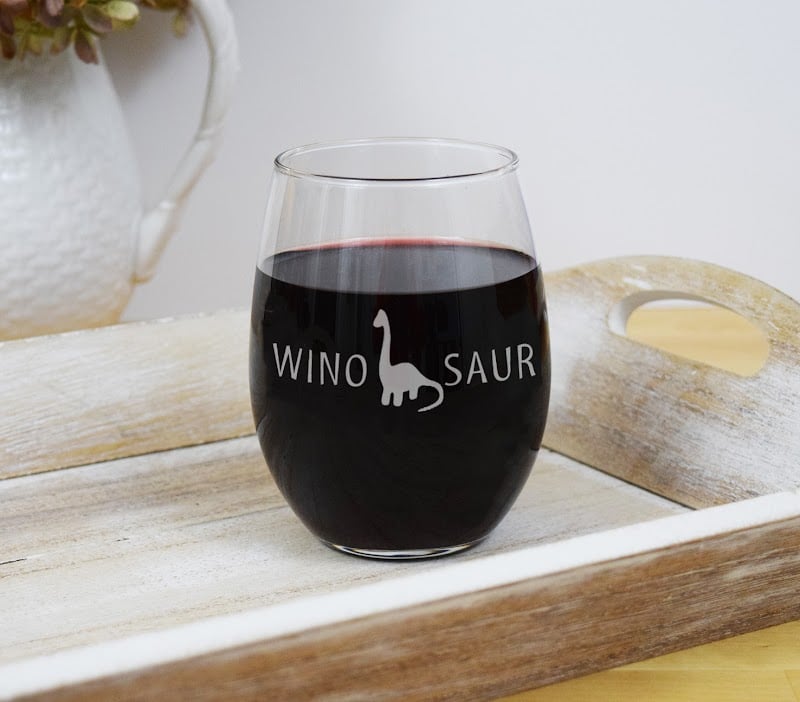 A clear glass with the word "WINO SAUR" and a dinosaur silhouette holds red wine, resting on a rustic wooden tray.