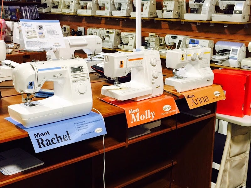 The image showcases a sewing store interior featuring three sewing machines labeled "Meet Rachel," "Meet Molly," and "Meet Anna" on a wooden display.