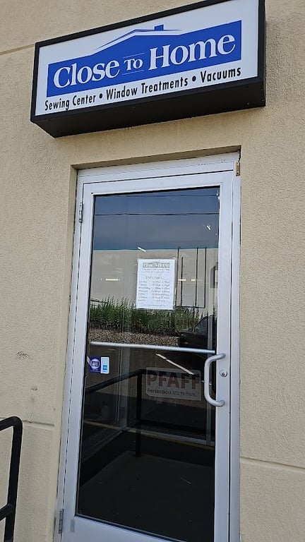 The image shows the exterior of "Close to Home," a sewing store with a prominent sign.