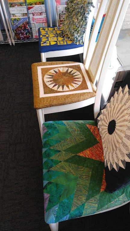 The image showcases colorful quilted chair cushions displayed in the Blue Hen Quilt Shop.