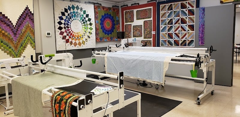 The interior of Blue Hen Quilt Shop features multiple quilting machines with vibrant fabrics displayed on the walls.