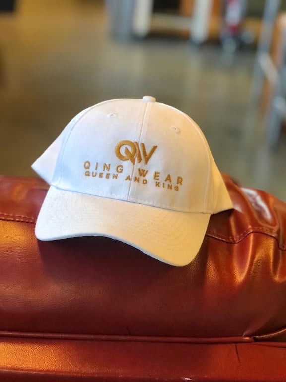 A white baseball cap with "QING WEAR QUEEN AND KING" embroidered in gold sits on a red leather surface.