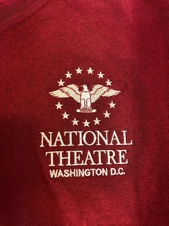 The image features a close-up of a red fabric with an embroidered logo for the National Theatre in Washington D.C.