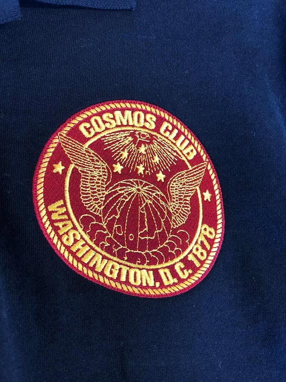 The image features a close-up of a navy blue garment displaying an embroidered patch. The patch reads "COSMOS CLUB WASHINGTON, D.C.