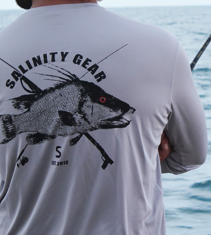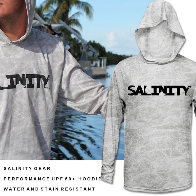 The image features a person wearing a light-colored shirt with a graphic of a fish and fishing rods, representing Salinity Gear.