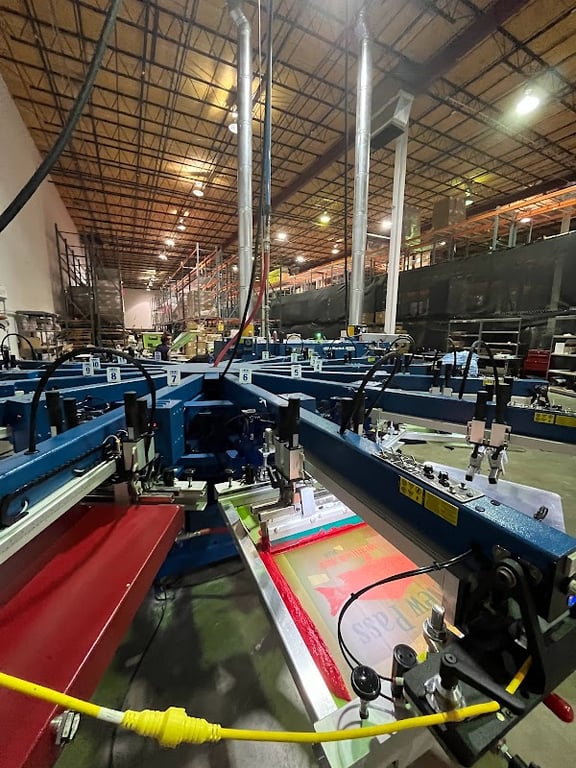 The image shows a spacious sewing store interior with multiple screen printing machines arranged in rows.