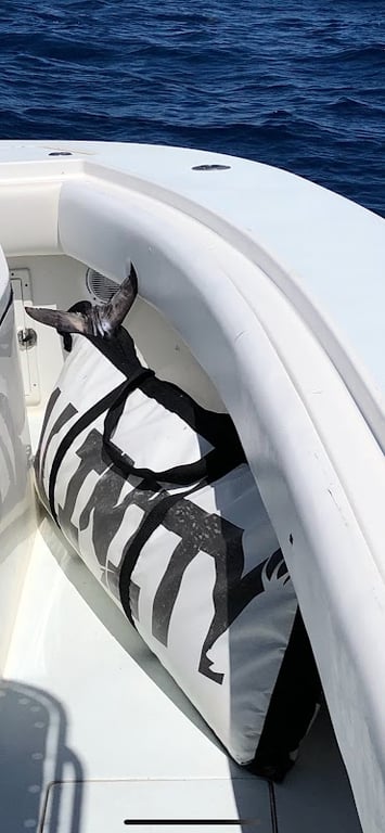 The image shows a large, white bag with bold black lettering resting on the edge of a boat, with a calm blue ocean in the background.