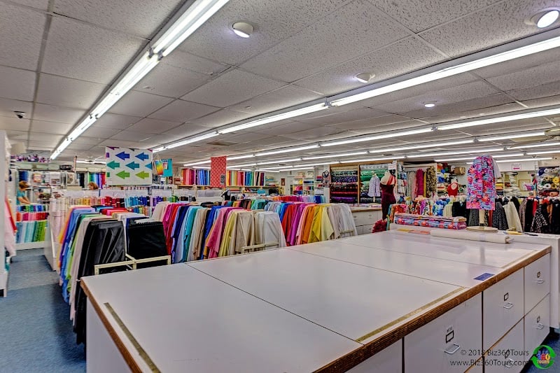 The Sewing Studio Fabric Superstore features a well-organized interior with shelves displaying colorful fabrics, sewing machines, and quilting supplies.