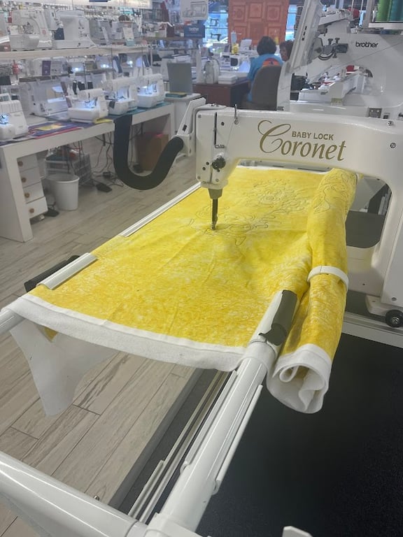 The image shows a Baby Lock Coronet quilting machine in a sewing store, with a vibrant yellow fabric being stitched.