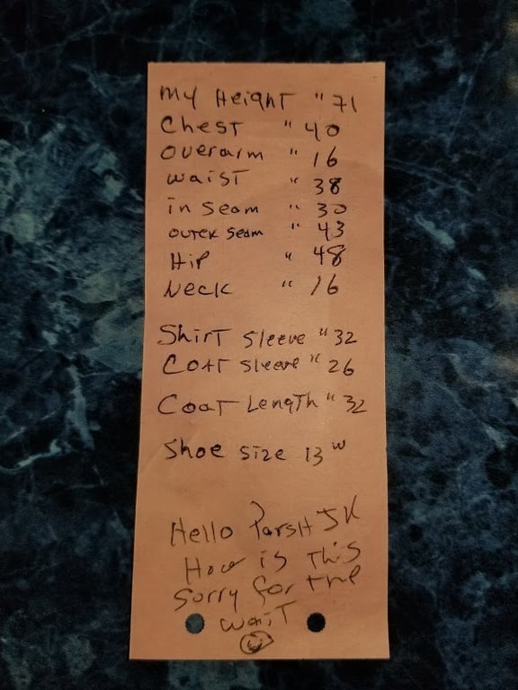 The image shows a handwritten note detailing various body measurements, including height, chest, waist, and sleeve lengths.