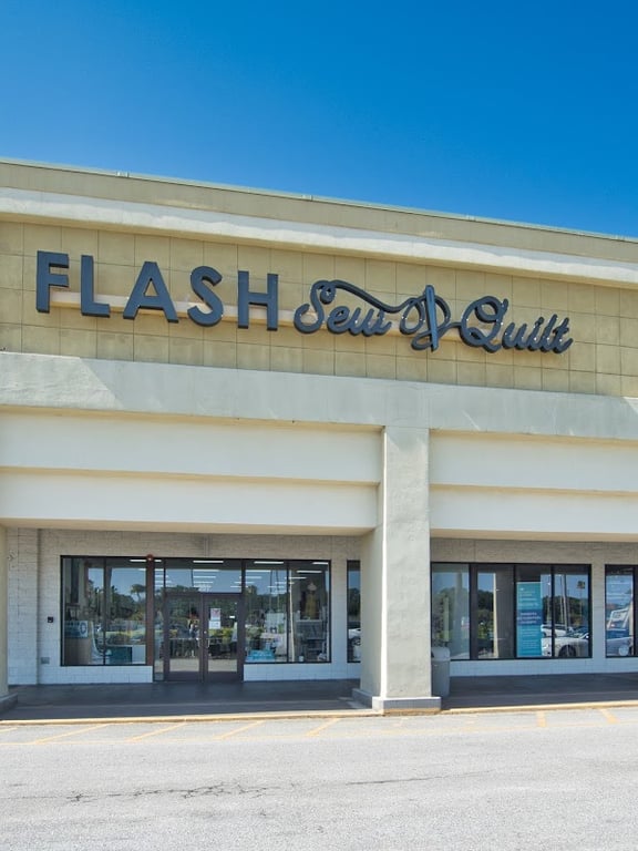 The image shows the exterior of Flash Sew & Quilt, a sewing store in Sarasota. The storefront features large windows displaying colorful fabrics and sewing supplies.