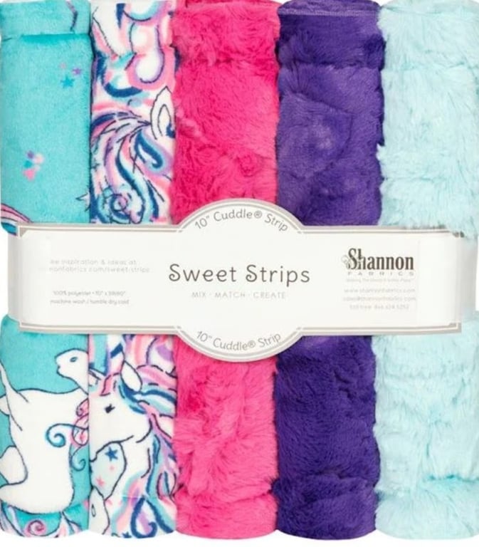 The image features a bundle of colorful fabric strips labeled "Sweet Strips" from Shannon Fabrics.
