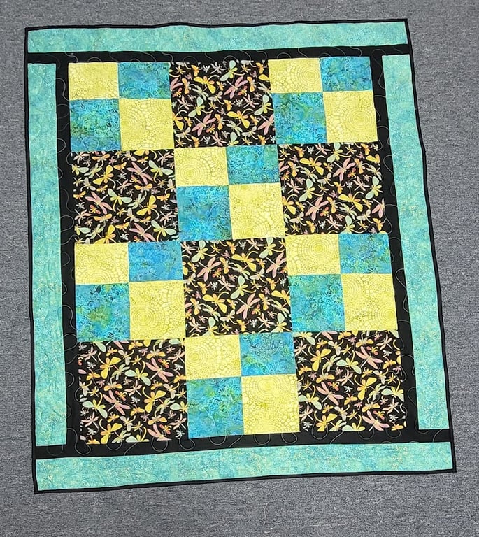 A vibrant quilt featuring a patchwork of yellow, blue, and floral patterns is displayed against a gray background.