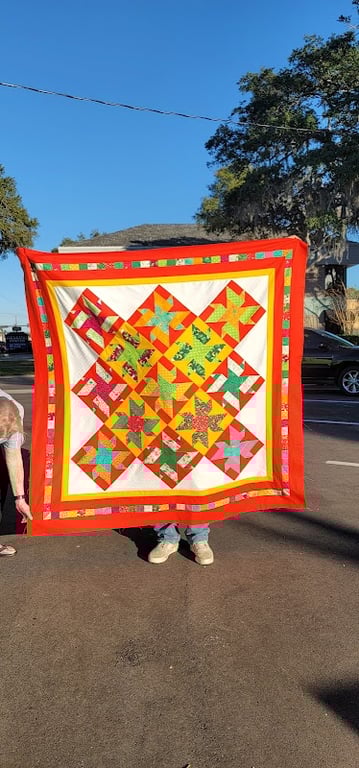 A vibrant quilt featuring colorful geometric patterns is held up by two people outdoors.
