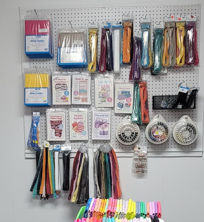 The image showcases a vibrant display of sewing supplies at Sarasota Quilts, featuring various mesh fabrics, colorful zippers, and sewing accessories.