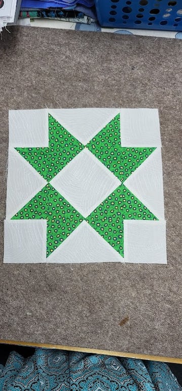A vibrant green and white quilt block featuring star patterns is displayed on a textured surface.