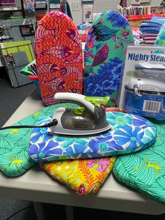 The image showcases a vibrant display of colorful ironing boards and a steam iron at Sarasota Sews Sewing Machine Store.