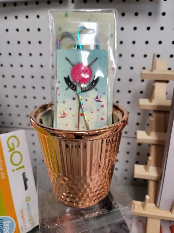 A shiny rose gold pot holds a packaged pair of colorful scissors, showcasing sewing accessories.