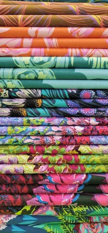 A vibrant display of colorful fabrics is stacked neatly, showcasing floral and patterned designs ideal for sewing projects.