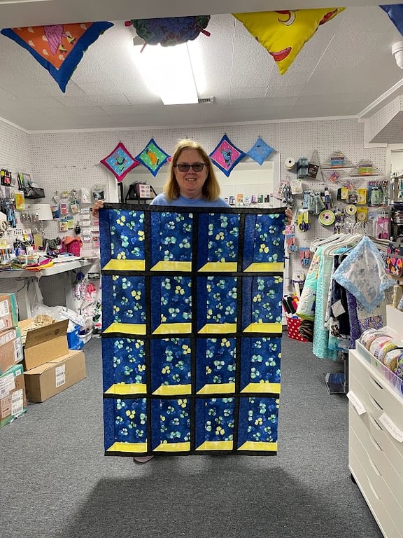 A woman stands in a sewing store, proudly holding a vibrant quilt featuring blue and yellow patterns.