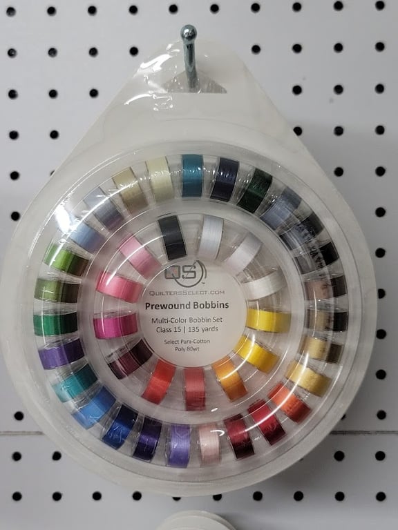 A display of prewound bobbins in various colors is showcased in a sewing store.