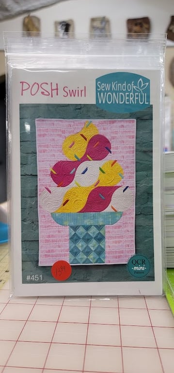 The image features a sewing pattern titled "POSH Swirl" displayed in a sewing store. The pattern showcases a colorful quilt design resembling a bouquet of flowers in a vase.