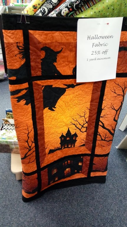 The image features a vibrant Halloween-themed fabric display at Cut Up and Sew, showcasing an orange quilt with silhouettes of witches and a haunted house.