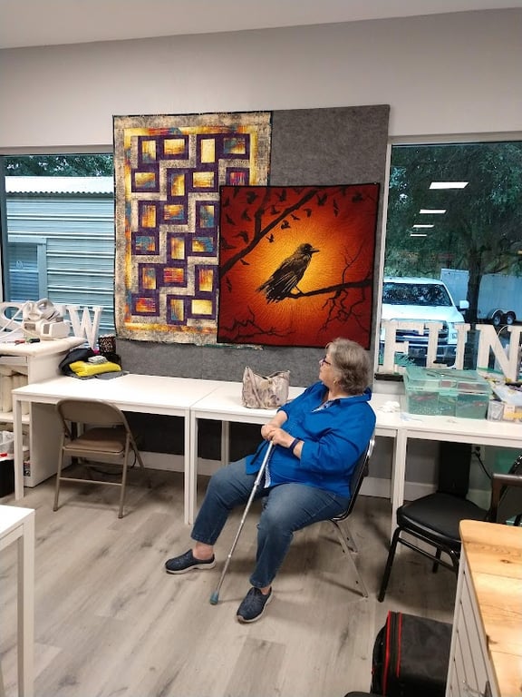A woman sits in a sewing store, wearing a blue shirt and holding a cane. Behind her, colorful quilts are displayed on the wall, showcasing vibrant patterns and designs.