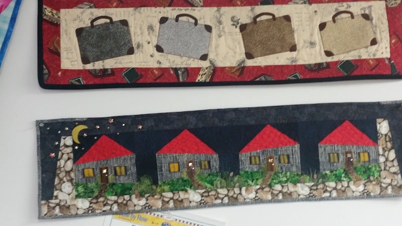 The image showcases two beautifully crafted quilted wall hangings displayed in a sewing store.