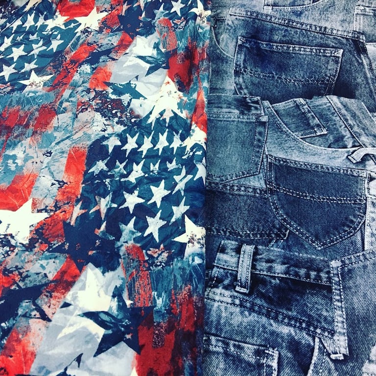 The image features two vibrant fabric patterns: one with a patriotic American flag design in red, white, and blue, and the other resembling denim jeans.