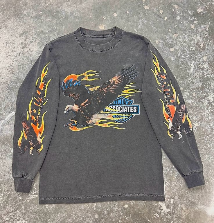 The image features a long-sleeve black shirt adorned with vibrant eagle graphics and flame designs.